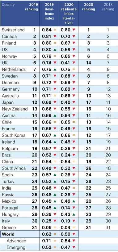 Az egyes kormányok által a járványra adott válaszlépések idén jelentősen csökkenthetik a globális gazdasági ellenállóképességet. Az index értéke 2020-ra az intézet becslései szerint 0,5 pontra eshet. Ennek oka, hogy az ösztönzőcsomagok számos ország fiskális és monetáris tartalékait felemésztik, ami a reziliencia mutatóik csökkenését is eredményezi. A jelentés szerint a legtöbb fejlett országban a monetáris politikai pufferek nagyrészt kimerülnek, így az ellenállóképesség legfőbb tényezője a fiskális mozgástér marad. A 2019-es rangsor első felében szerelő országok közül az Egyesült Királyságban, Japánban és az Egyesült Államokban várható a költségvetési tartalékok leggyorsabb kimerülése, így az ő indexértékeik csökkennek legnagyobb mértékben. Kína ellenállóképessége valószínűleg viszonylag változatlan marad, elsősorban a gyors válaszlépéseknek köszönhetően, amely lehetővé tette a gazdaság hamarabb történő újraindítását is. A világ három legellenállóbb országa várhatóan Svájc, Finnország és Kanada marad.