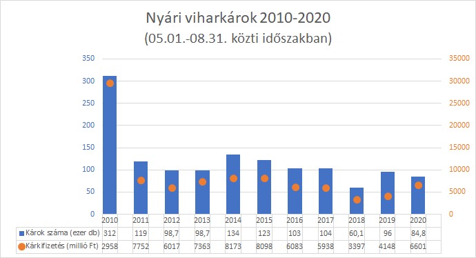 A múlt évinél kevesebb lakossági bejelentés nyomán az akkorinál több mint másfélszer nagyobb összeget fizettek már ki vagy fizethetnek még valószínűsíthetően ki a biztosítók az idén május elseje és augusztus 31 közötti viharkárokra. A társaságokhoz ebben a periódusban közel nyolcvanötezer (tavaly kilencvenhatezer) bejelentés érkezett egyéni és társasházak részéről vihar, felhőszakadás, jégverés, tetőbeázás, villámárvíz, stb. címén. A 2019-es évben a négy hónap alatt ezek nyomán a lakásbiztosítási szerződésekre 4,1 milliárdot fizettek ki a biztosítók, idén előreláthatólag 6,6 milliárdot. (Ebben az összesítésben nincsenek benne a mezőgazdasági károk és az időjárás következtében az ipari létesítményekben, közintézményekben, stb. keletkezett rongálódások, valamint a hét eleji károk sem.)