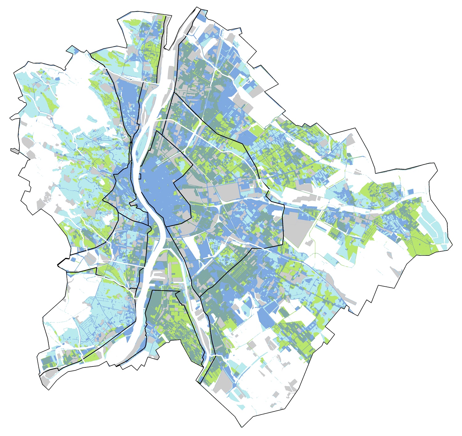 (Világoskék területek: vízvisszatartás; világoszöld területek: szikkasztás és vízvisszatartás; sötétebb kék területek: vízvisszatartás és párologtatás; sötétebb zöld területek: szikkasztás, vízvisszatartás és párologtatás) – Forrás: Csizmadia Dóra