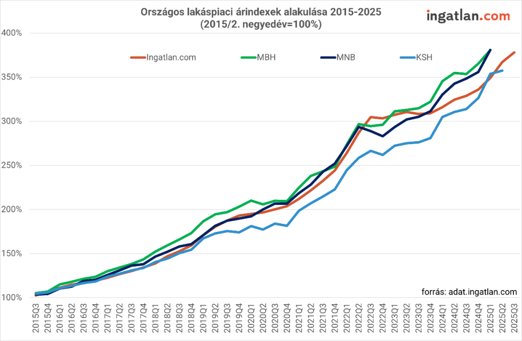 ● Országosan 2,7 százalékkal nőtt a lakóingatlanok ára szeptemberben az előző hónaphoz képest, Budapesten 2,6 százalékkal. A havi lakásdrágulás üteme több mint duplájára nőtt szeptemberben.