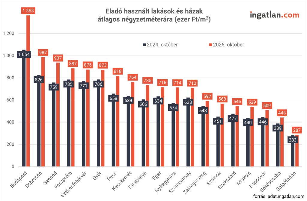 A fővároson kívüli piacon a legjelentősebb kínálattal rendelkező városok közül Debrecenben október elején 987 ezer forint a négyzetméterárak középértéke, ami éves szinten 19 százalékos növekedést jelent. Pécsen 24 százalékos éves drágulás következményeként 818 ezer forintra, Szegeden 23 százalékos áremelkedés nyomán 937 ezer forintra nőttek az árak.