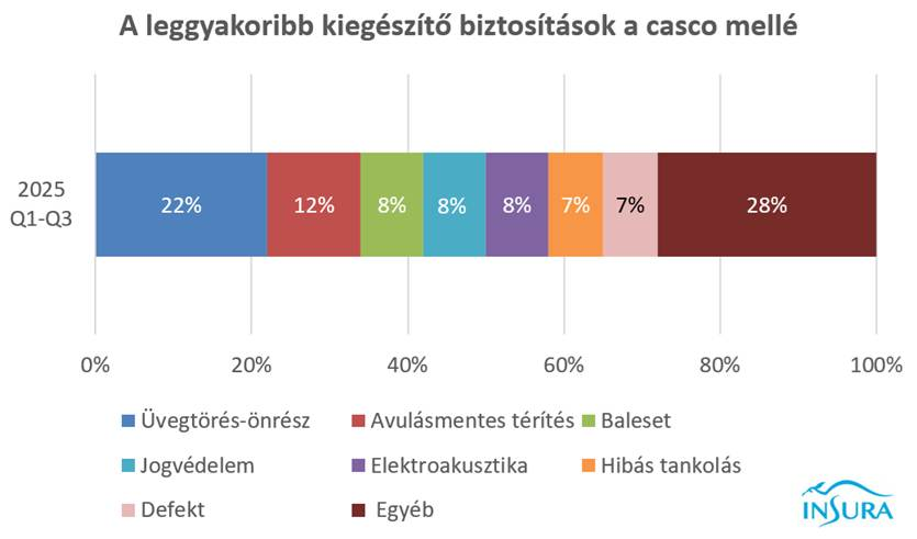 A casco szerződések mellé a szerződők 30 százaléka köt valamilyen kiegészítő biztosítást is, közülük számosan több plusz fedezetet is igényelnek. Idén eddig messze a leggyakoribb kiegészítő fedezet volt az üvegkár-önrészbiztosítás, ez tette ki az összes ilyen szerződés 22 százalékát. Az imént említett avulásmentes térítést a szerződők 12 százaléka választotta. A sorban következő további kiegészítők: balesetbiztosítás (8%), jogvédelem (8%), az autóban található értékes elektroakusztikai berendezések plusz biztosítása (8%), illetve a hibás tankolás biztosítása (7%), illetve a defektbiztosítás (7%).