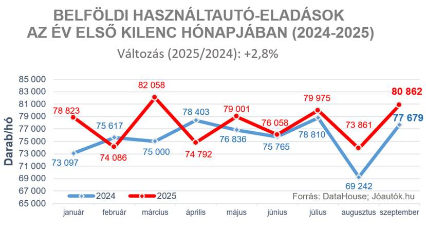 A DataHouse előzetes adatai szerint a tavaly szeptemberi 77 700-hoz képest 4,1 százalékkal több, 80 900 személygépkocsi cserélt gazdát a hazai használtautó-piacon az elmúlt hónap során, ami a valaha volt második legnagyobb havi érték. Szeptember végére sosem volt ilyen magas, 699 600 az adott év belföldi használtautó-adásvételeinek száma: az előző év háromnegyedévében is csupán 680 400 átírást regisztráltak. Ezzel immár szinte biztossá vált, hogy év végére megdől a tavaly beállított éves rekord is.