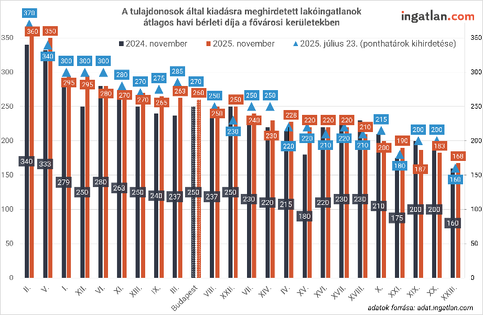 ● A fővárosban november elején a bérleti díjak középértéke 260 ezer forintot tett ki. Debrecenben 240 ezer forint, míg a legolcsóbb vármegyeszékhelyeken, Békéscsabán és Szekszárdon 100 ezer forinttal számolhatnak a bérlők.