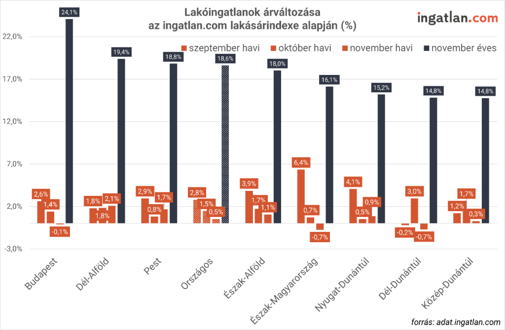 A fővárosi agglomeráció kedvelt célpont maradt, ennek eredményeként, Pest vármegyében novemberben 1,7 százalékos havi és 18,8 százalékos éves áremelkedést mutat az index.