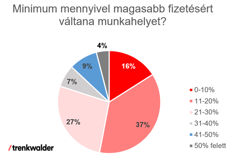 A Trenkwalder felmérése folyamatosan nyomon követi azt is, hogy mekkora eltérés ösztönözné az alkalmazottakat munkahelyváltásra. Jelenleg összes válaszadó 16 százaléka már 10 százalékkal magasabb fizetésért is munkahelyet váltana, 20 százalékkal kedvezőbb alternatív állásajánlatért pedig 53 százaléknyian hagynák ott jelenlegi állásukat. Ez utóbbi érték tavaly ilyenkor 57 százalék volt, ami szintén a munkavállalók óvatosságának kismértékű növekedésre utalhat.