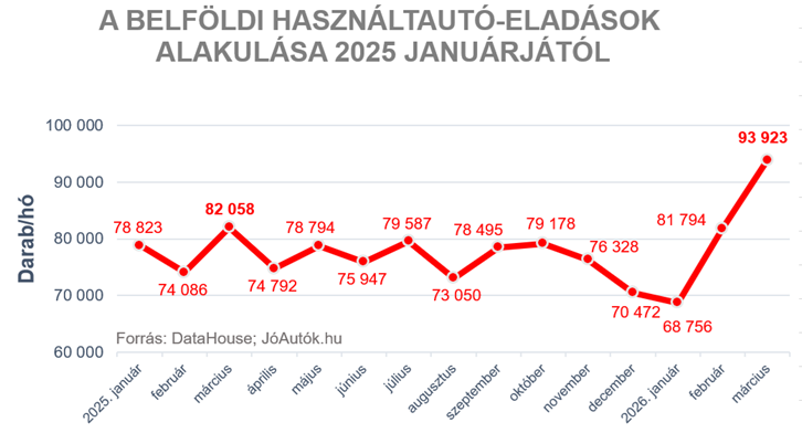 A DataHouse legfrissebb előzetes adatai szerint márciusban minden eddiginél magasabban alakult a belföldi használtautó-adásvételek száma: a hazai piacon az elmúlt hónapban mintegy 93 900 személygépkocsi cserélt gazdát. Ez az érték nem kevesebb, mint 14 százalékkal haladja meg a tavaly márciusban beállított eddigi rekordot (82 ezer adásvétel). Az ilyenkor szokásos szezonális aktivitást ezúttal a januárban elmaradt vásárlások pótlása, illetve áttételesen a használtautó-import felfutása is segíthette.